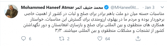 – محمد حنیف اتمر محمد حنیف اتمر (MHaneefAtmar) 3 ژانویه 2020